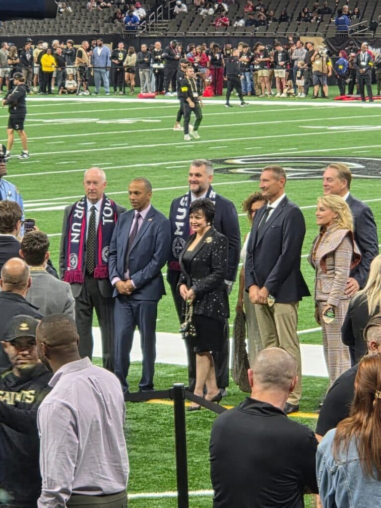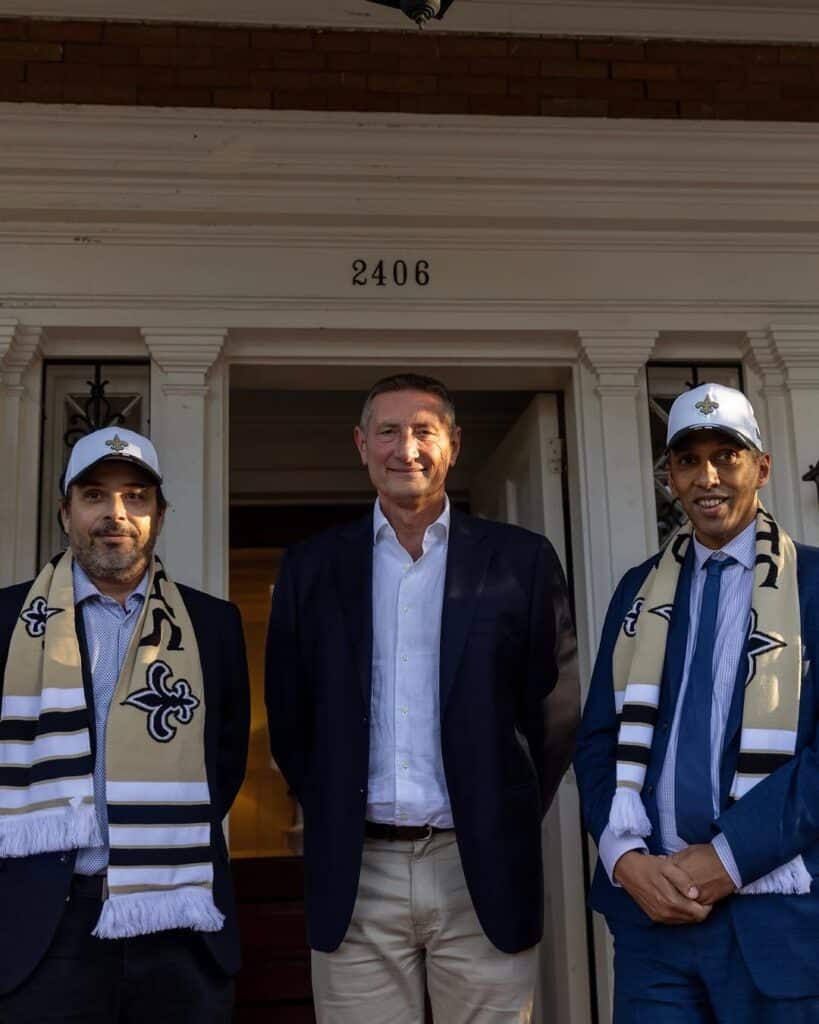 Photo 1 : Frédéric Paquet au consulat général de France à la Nouvelle-Orléans avec notamment Alan Nobili et Rodolphe Sambou ; Photo 2 : Frédéric Paquet sur le terrain des Saints de la Nouvelle-Orléans quelques instants avant le début du match contre les Falcons d’Atlanta